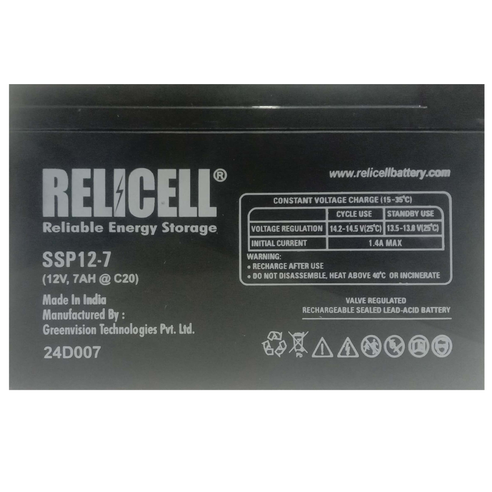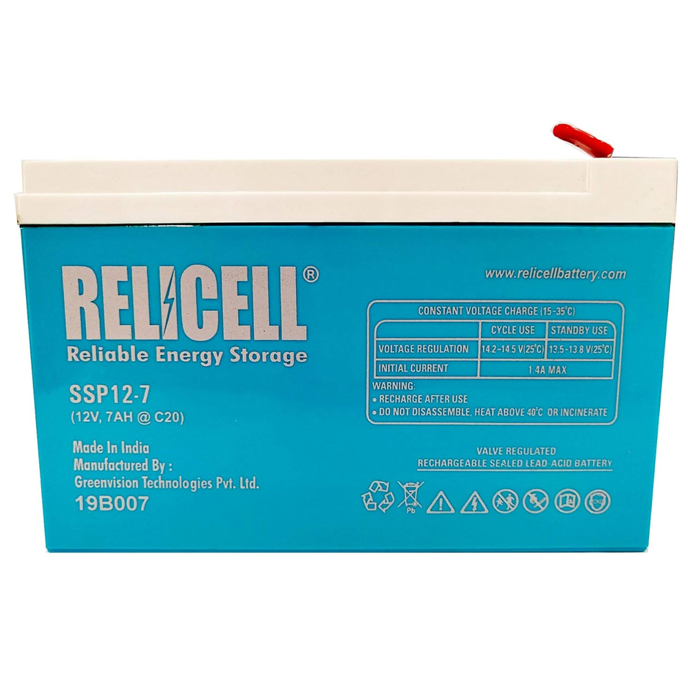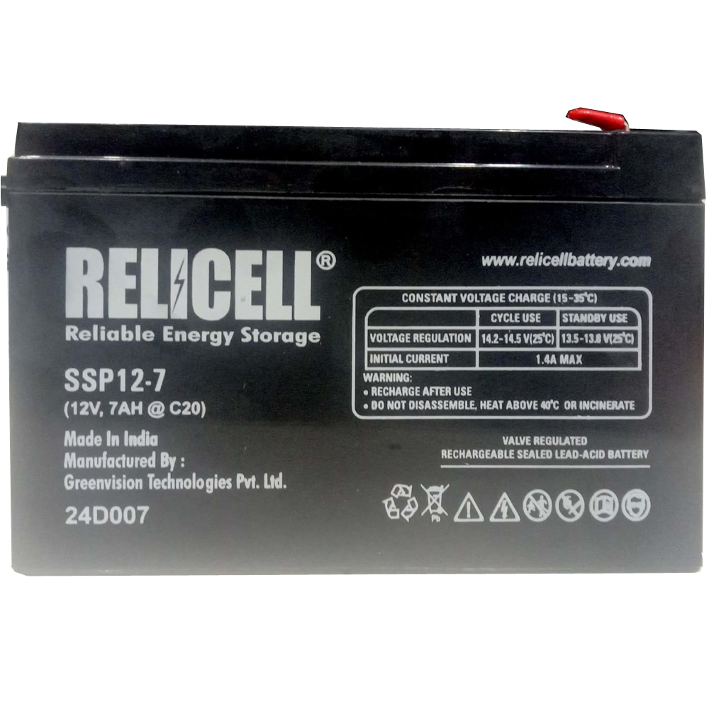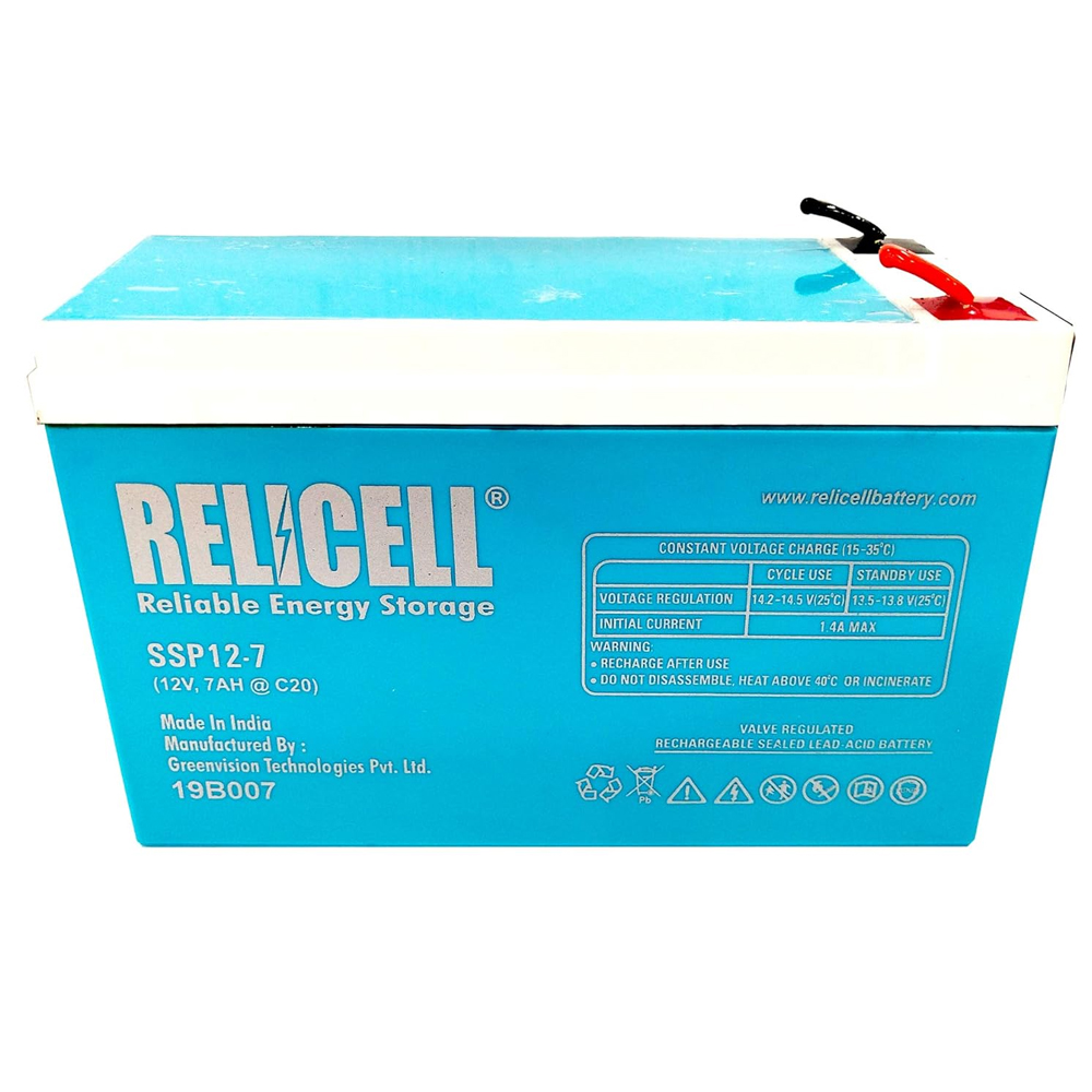 - The Relicell 12V, 7Ah Battery for UPS is a maintenance-free, valve-regulated lead-acid (VRLA) battery that is designed for use in uninterruptible power supplies (UPS).
